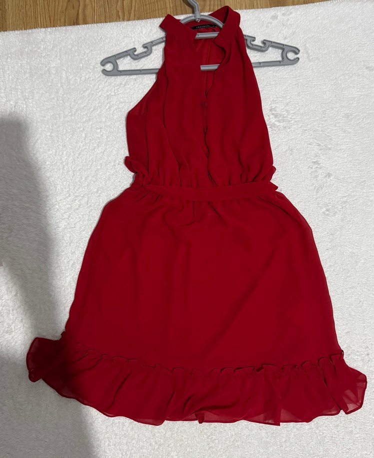Kırmızı mini boy, yüksek yakalı ve kolsuz kadın elbise. Etek ucu fırfırlı, bol kesim ve minimalist bohem tarzda, parti için uygundur. Günlük te kullanılır. 1 kere giydim sadece