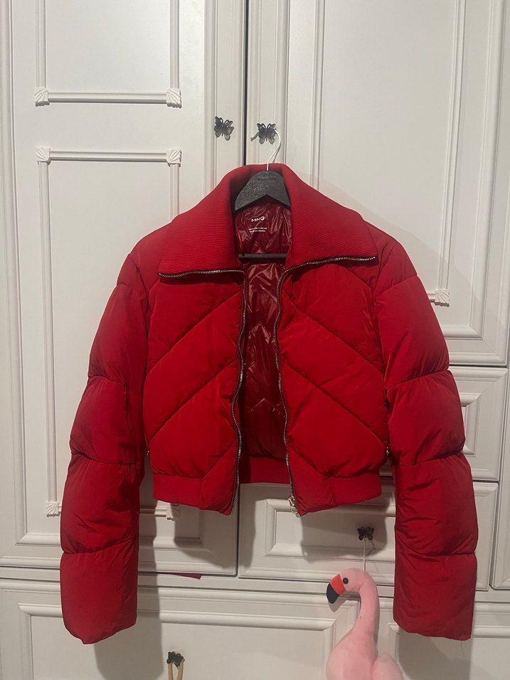 Kırmızı renkli, kısa kesim, kadın kışlık mont. Yüksek yakalı, uzun kollu ve fermuarlı. Yumuşak, sıcak kumaştan üretilmiş, gençler için trend sokak stili.