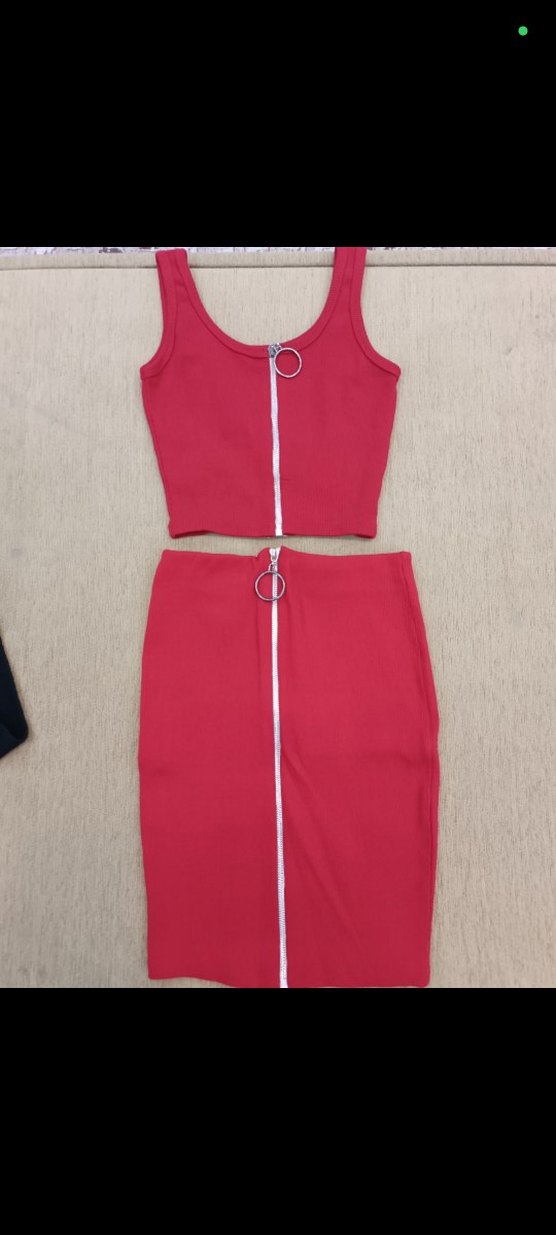 Cesur kırmızı iki parçalı takım, ön fermuar detaylı kolsuz crop top ve kalem mini etekten oluşur. Düz, sentetik kumaştan, sokak modasına uygun.