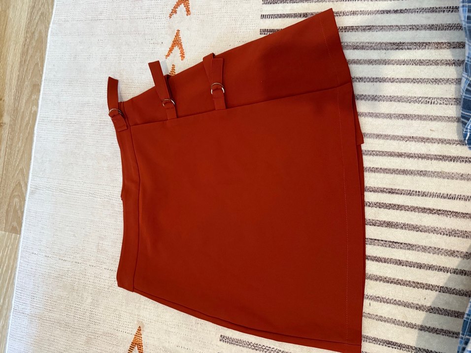 Kırmızı, parlak sentetik kumaştan mini, kemerli, dar kesim bir etek. Minimalist, sokak stili ve günlük kullanıma uygun.
