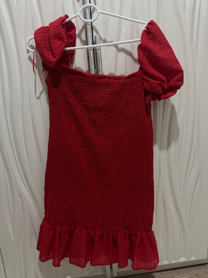 Kırmızı mini keten elbise, straplez yaka ve fırfır detaylarına sahiptir. Rahat ve bohem tarzıyla günlük kullanıma uygundur. Kolsuz tasarım konfor sunar.