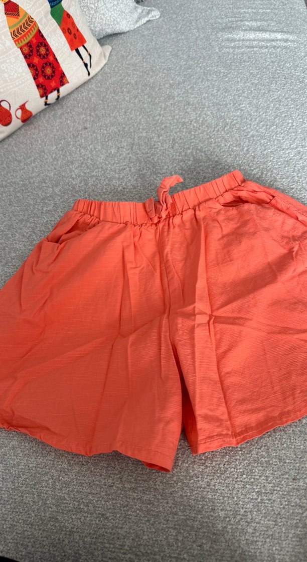 Kırmızı keten kumaştan, rahat ve bol kesim mini şort, günlük kullanım için elastik beliyle konfor sağlar.