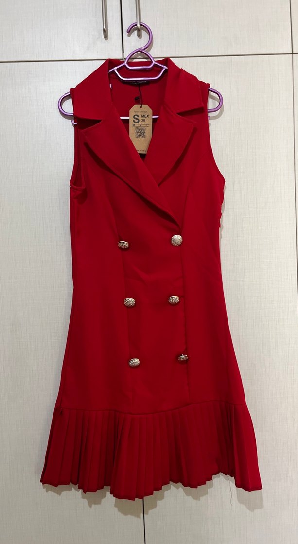 Kırmızı, kolsuz ve düğmeli ön kısmı olan, sentetik kumaştan mini kısa boyda klasik tarzda kadın ceketi. Canlı renkli desenlere sahiptir.