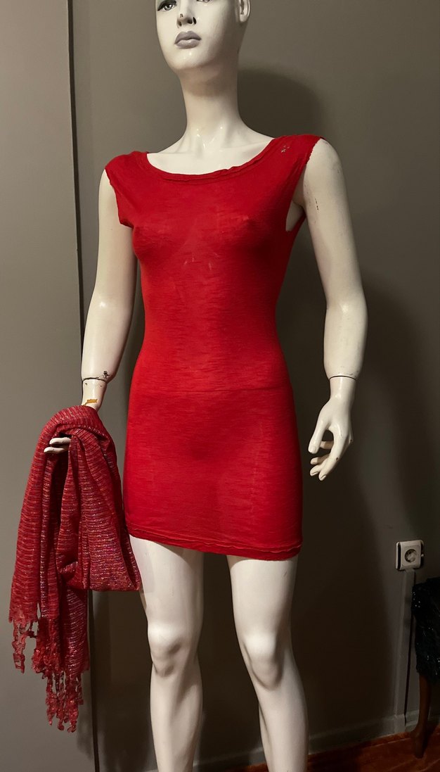 Kırmızı parlak renkte, kolsuz ve drapeli detaylara sahip, Penye kumaştan mini triko elbise. Günlük kullanım için uygun, modern tarzda.