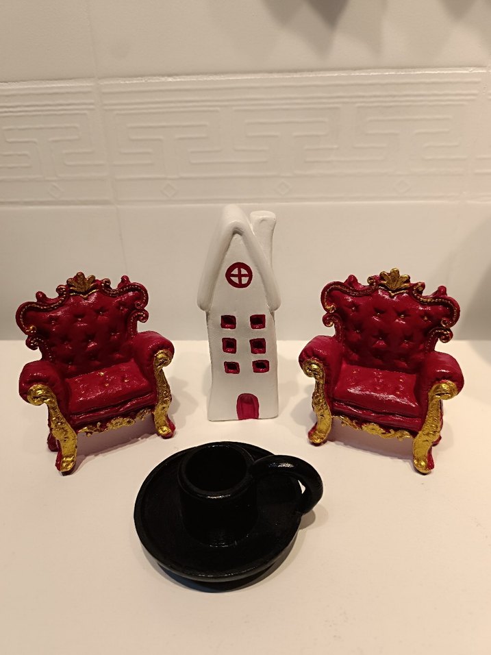 İki koyu kırmızı mini koltuk, altın detaylarla ve küçük beyaz ev dekoru yer alıyor. Siyah bir mumluk da bulunuyor. ️
