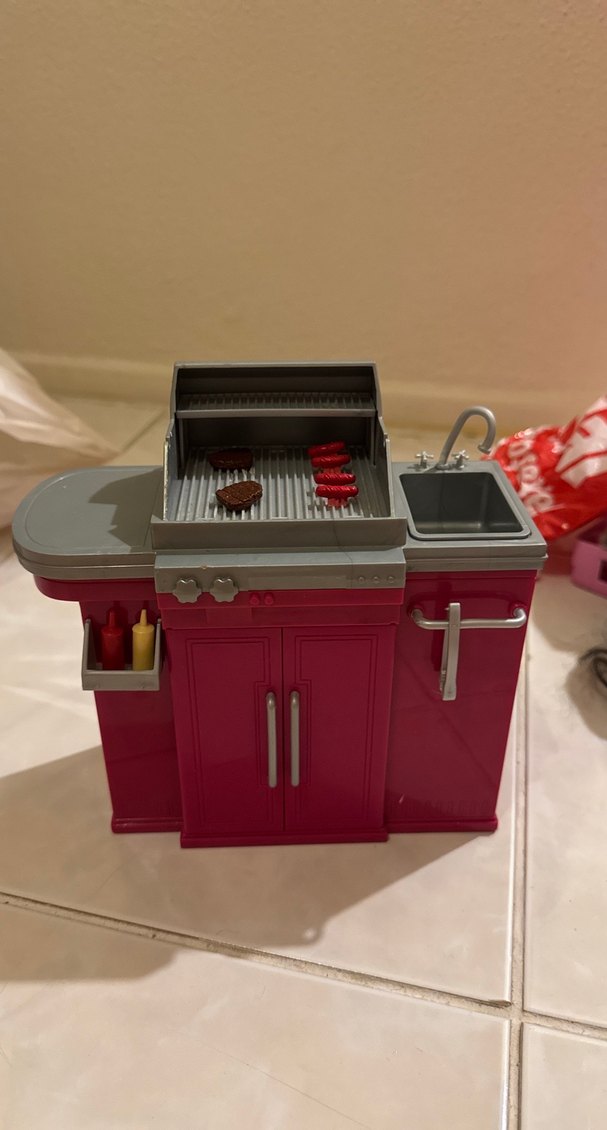 Koyu kırmızı mini mutfak ızgarası, üzerinde yiyecekler, lavabo ve musluk ile kapaklı saklama bölmeleri içerir.