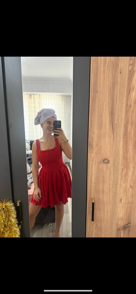 Yumuşak pamuktan yapılmış, straplez ve kolsuz kırmızı mini elbise. Parlak dokusu ve sade tasarımıyla günlük kullanıma uygun, rahat ve şık bir seçenek.