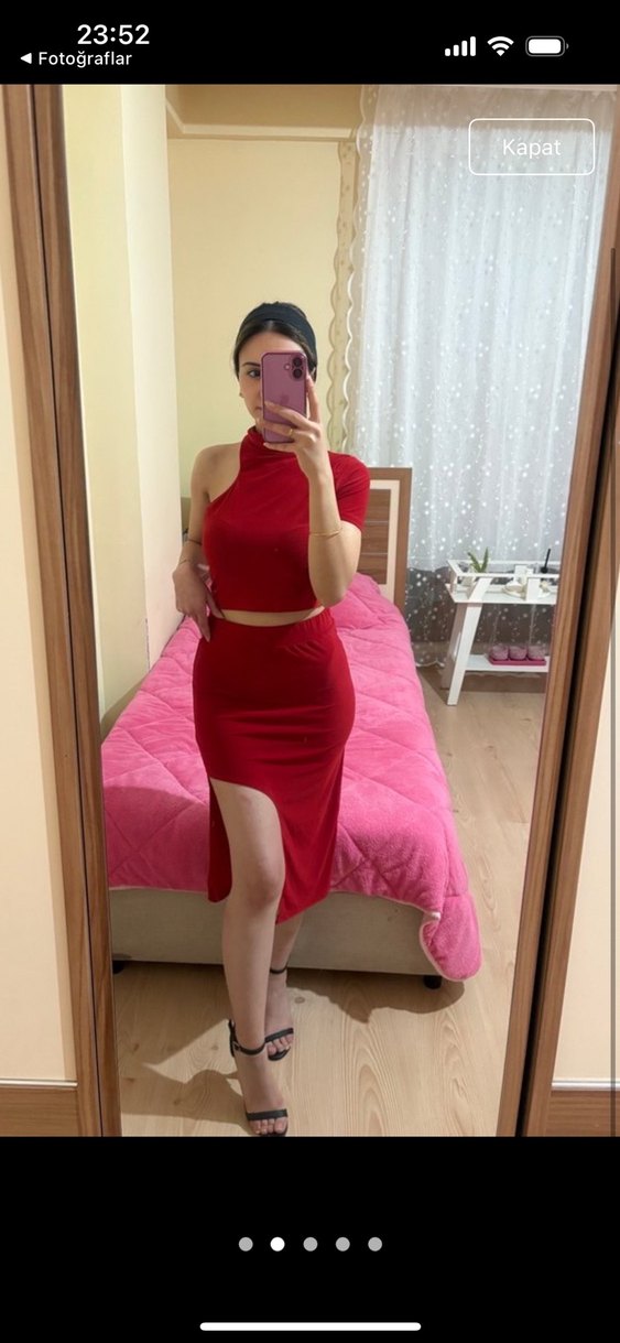 Parlak kırmızı kumaştan, straplez yaka ve yırtmaç detaylı, mini boy abiye elbise. Romantik akşamlar için şık ve modern tasarım.