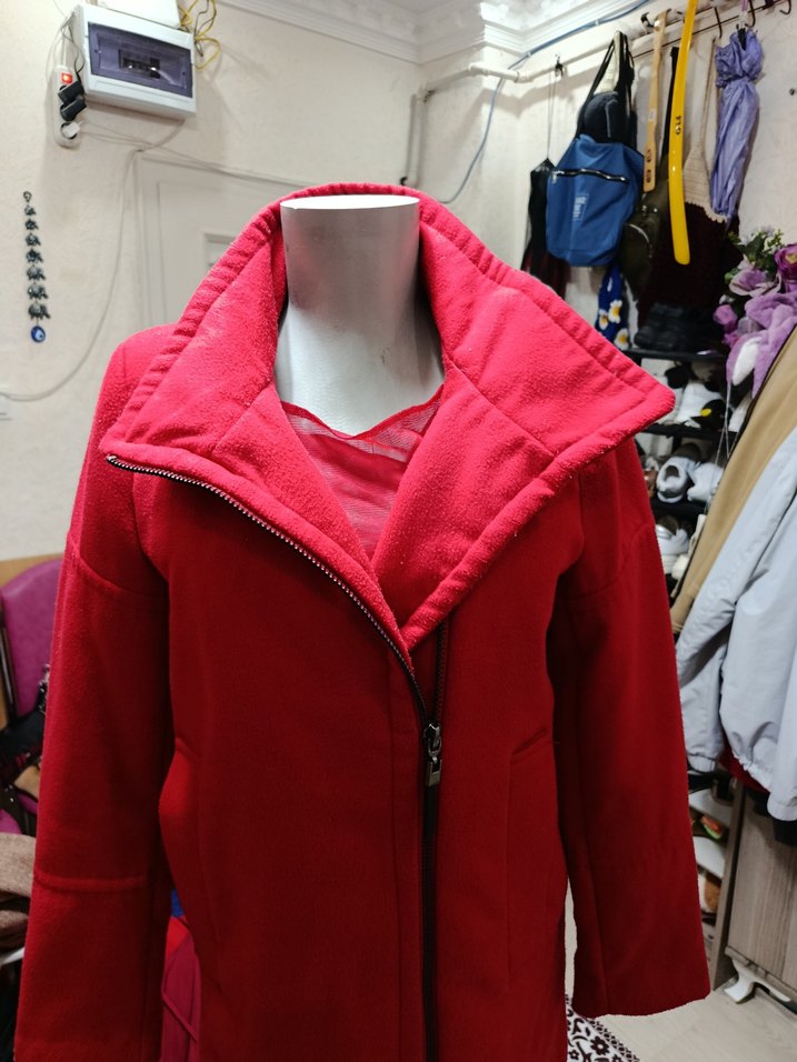 Kırmızı renkte, yumuşak ve sıcak polar kumaştan yapılmış hamile ceketi. Yüksek yakalı, uzun kollu ve fermuarlı ön kapamalı, rahat ve günlük sokak tarzı için uygundur.