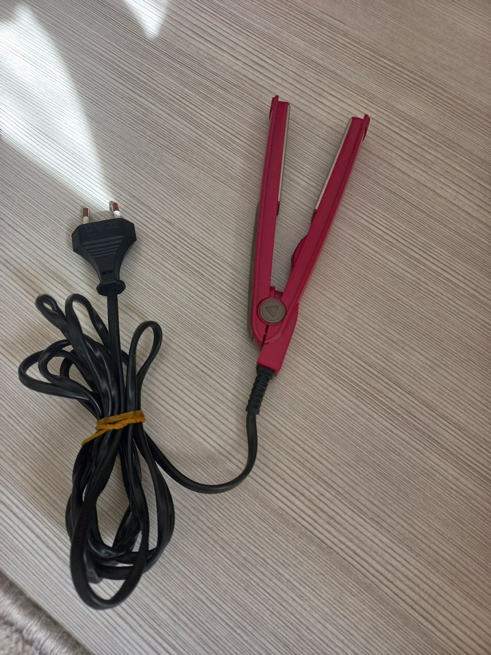 Kompakt tasarımlı kırmızı mini saç düzleştirici, uzun siyah kablo ve iki uçlu fiş ile kolay kullanım sağlar.