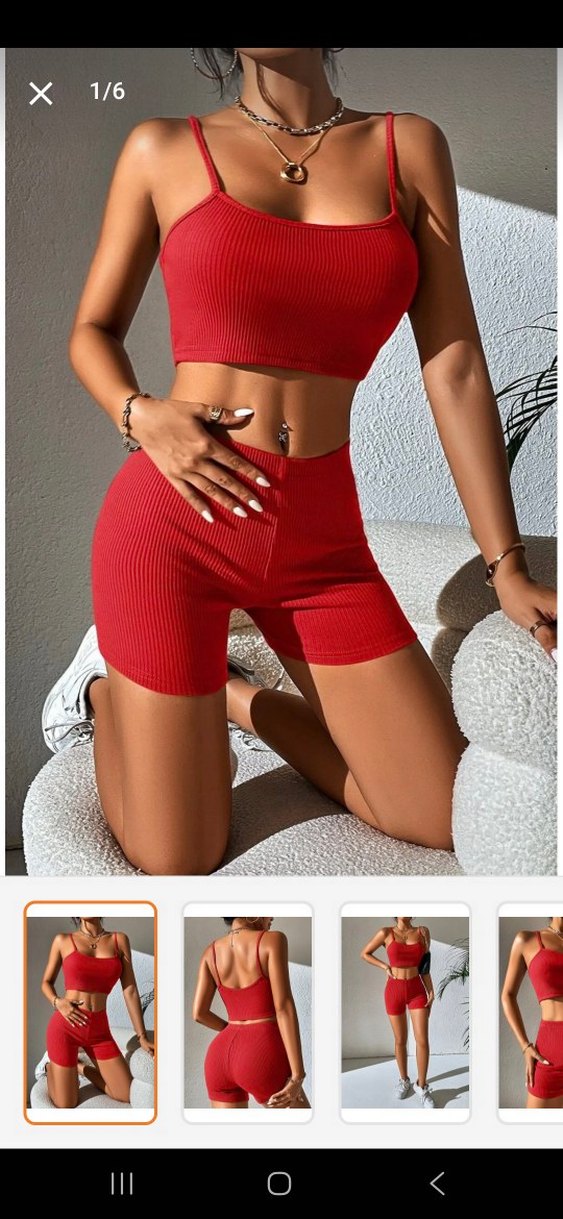 Parlak kırmızı sentetik kumaştan, düz yakalı ve ince askılı, mini boy kadın aktif giyim takımı. Spor için cesur ve şık bir sokak stili sunar.