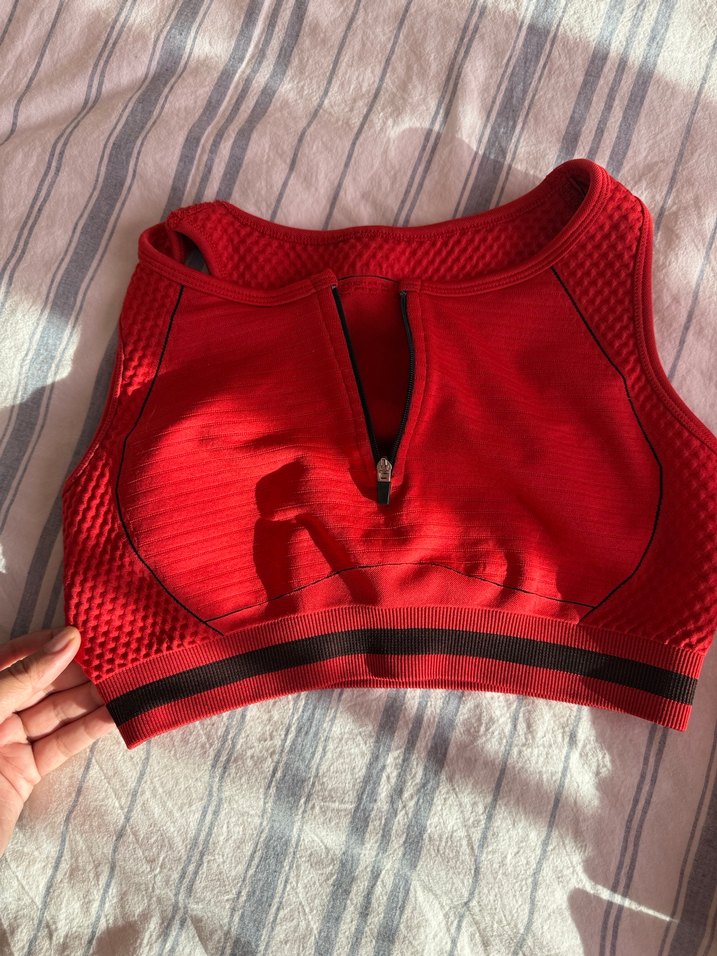 Koyu kırmızı renkte, kısa boylu sporcu sütyeni. Önden fermuarlı, dokulu ve desensiz, siyah şerit detaylı, sokak tarzına uygun.