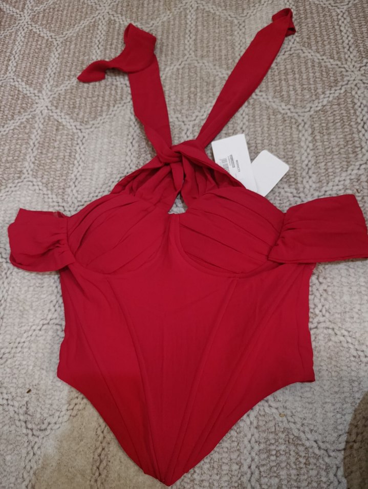 Kırmızı mini boyda, straplez ve askılı detaylara sahip .