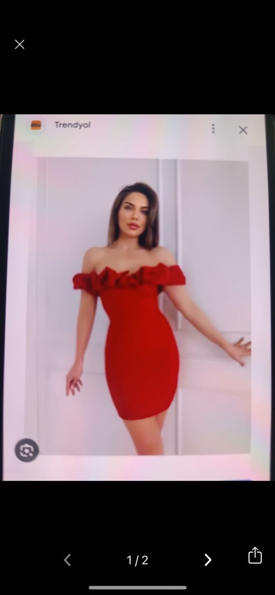 Kırmızı parlak sentetik kumaştan, straplez ve fırfırlı detaylı, vücuda oturan mini elbise. Romantik buluşmalar için uygundur.