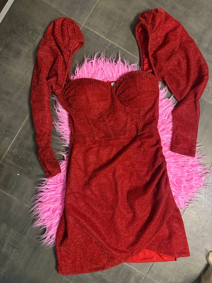 Kırmızı, vücuda oturan mini abiye elbise, straplez yaka ve kürk detaylı uzun kollara sahiptir. Cesur ve gösterişli parti tarzı için uygundur.