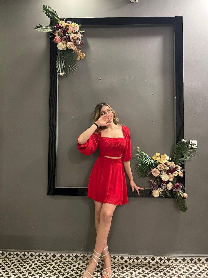 Kırmızı mini elbise, straplez yakalı ve ince askılıdır. Saten kumaştan yapılmış, salaş kesimli ve parlak yüzeye sahiptir. Romantik akşamlar için şık ve iddialı bir tercihtir. ❤️