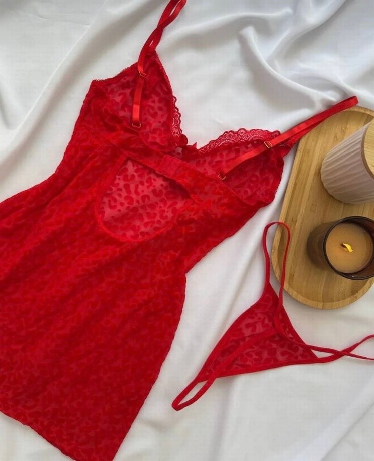 Kırmızı, ince askılı, tanga takım bohem tarzda mini gecelik. Vücuda oturan kesimi ve uyumlu alt parçası ile rahat bir uyku deneyimi sunar.