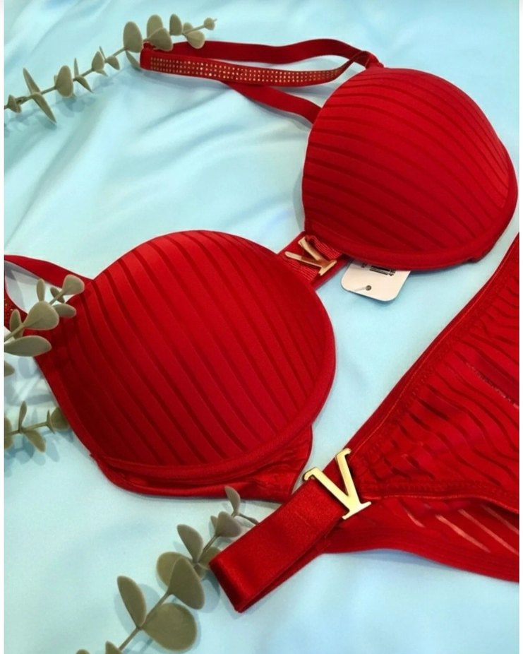 Canlı kırmızı renkte, kısa kesim ve desen içermeyen, çağdaş ve göz alıcı tasarıma sahip sütyen takımı. ❤️