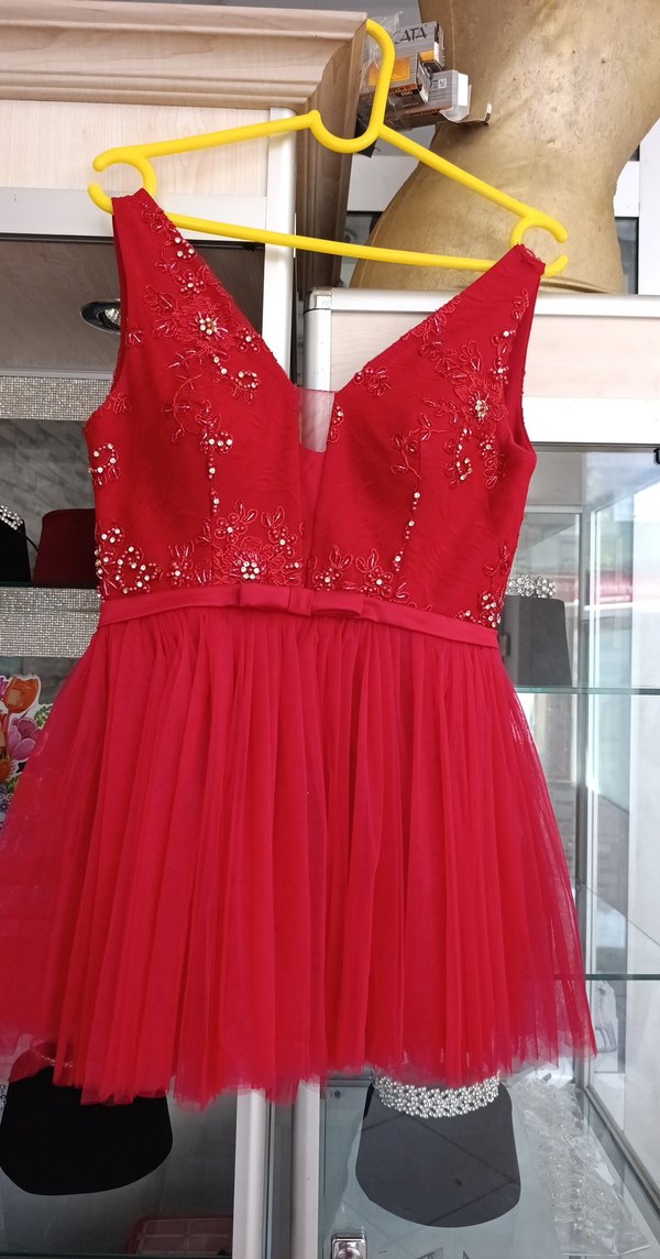 V yaka ve kolsuz tasarıma sahip, işlemeli ve boncuk detaylı kırmızı mini abiye elbise. Parlak ve bohem tarzıyla düğünler için uygundur.