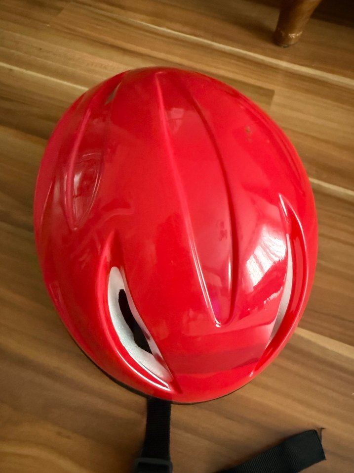Kırmızı renkli, desen içermeyen motosiklet kaskı, tokalı ve minimalist tasarıma sahiptir. Moda öncülerine uygundur. ️