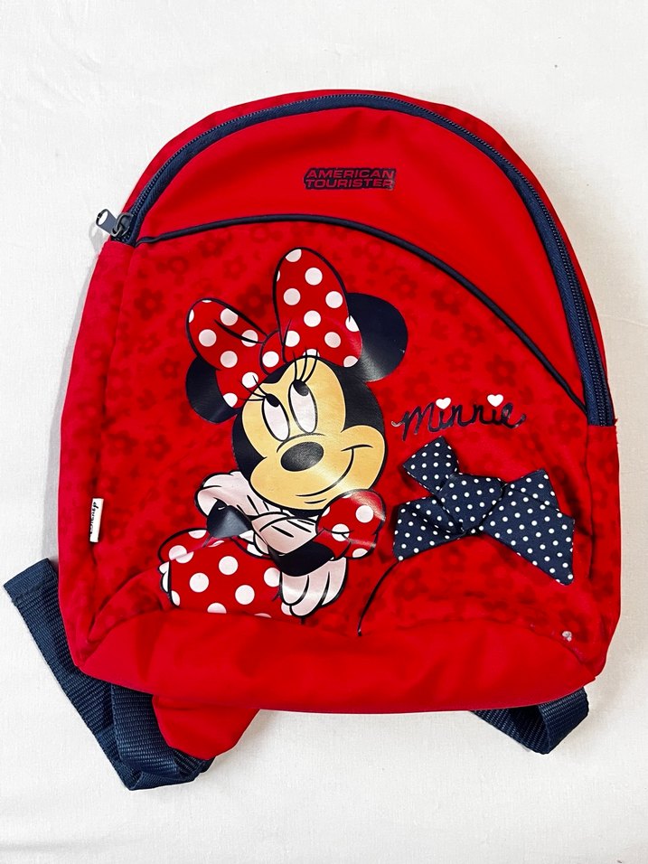 Renkli kırmızı çocuk okul çantası, Minnie Mouse baskısı ve puantiyeli detaylarla. Önünde fermuarlı cep ve ayarlanabilir askılar bulunur.