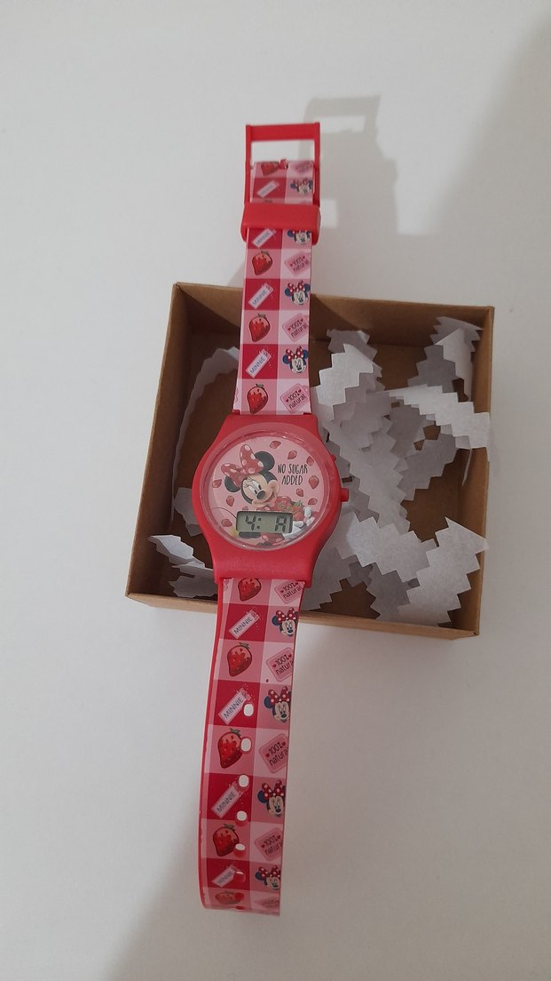 Kırmızı renkli, tokalı kayışa sahip kol saati. Canlı ve vintage Minnie Mouse temalı, dijital ekranlı eğlenceli tasarım. ⌚ Ürünü hediye aldım veremedim lisanslı ürün hiç kullanılmadı jelatini üstünde