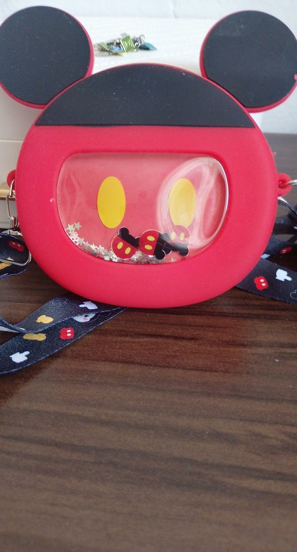 Kırmızı renkli, Minnie Mouse temalı kız çantası, baskılı detaylar ve kurdele askıya sahip, modaya uygun bir aksesuar.