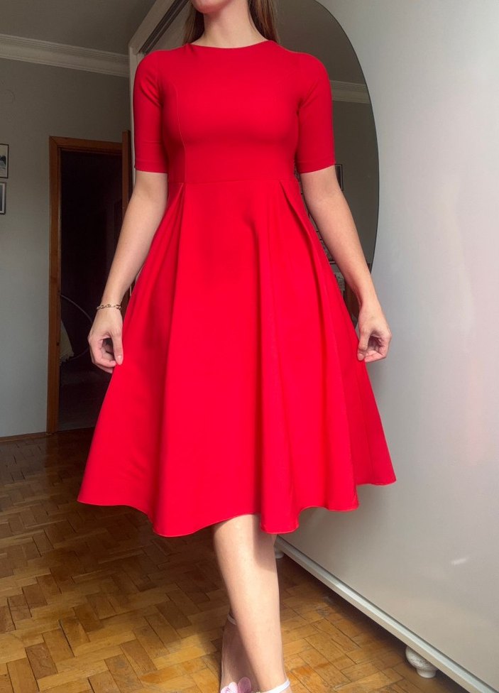Kırmızı, vücuda oturan midi elbise; yuvarlak yaka ve pileli etek detayına sahiptir. İnce askılı kollu, yumuşak sentetik kumaştan üretilmiştir. ❤️