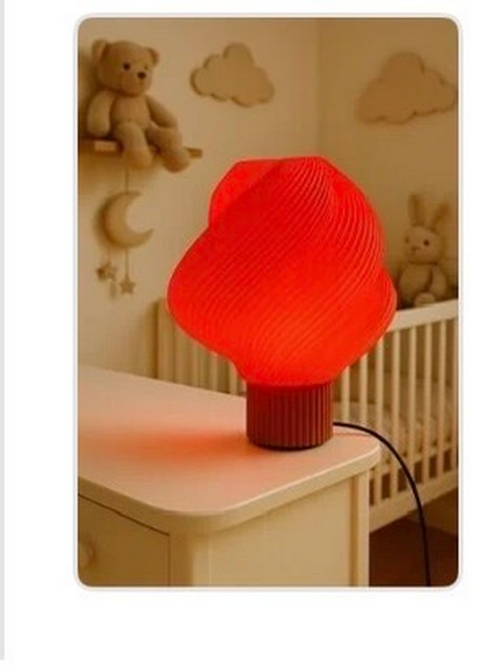 Modern dalgalı tasarıma sahip kırmızı masa lambası, odanıza sıcak bir atmosfer katar.
