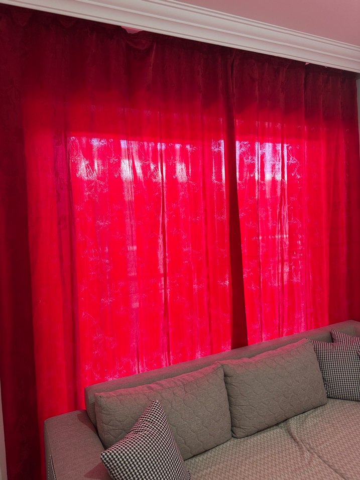 Modern tarzda, canlı kırmızı renkte, desen içeren perde fon olarak kullanılabilir çocuklar için karartma perde olarak kullanılabilir ben kızım için kullandı artık büyüdüğü için ihtiyaç fazlası köy evlerine nostaljik bir görüntü için kullanılabilir İki parçadır Boy 270Cm En 162 cm dir
