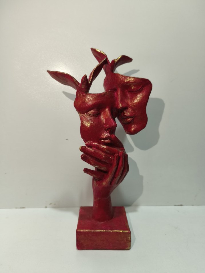 Koyu kırmızı renkte, iki yüz ve bir el figürlü soyut tasarıma sahip figürin. Kare taban üzerinde durmaktadır. ️
