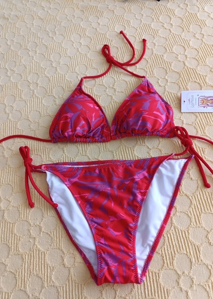 Sıfır etikette kırmızı mor renkli üçgen sütyenli desteksiz bikini 40 beden