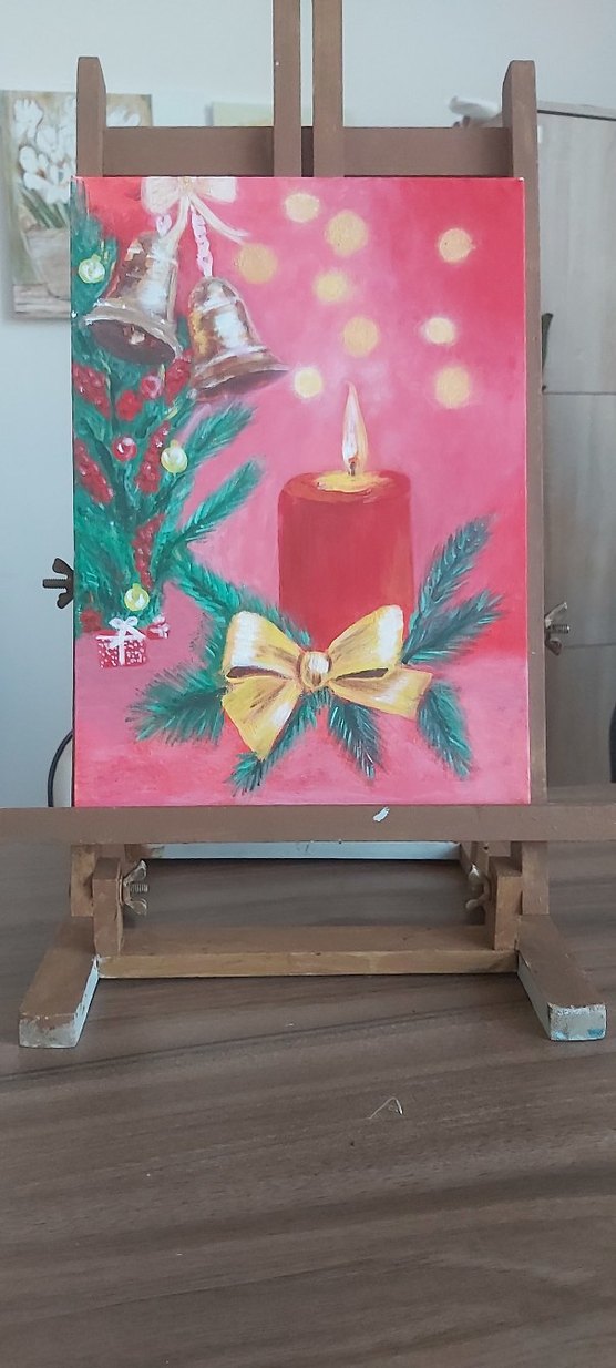 Kırmızı mum, ahşap mumluk üzerinde yeşil çam dalları ve sarı kurdele ile süslenmiş, şenlikli bir atmosfer yaratıyor. ️şömine ustune ..raflara evinize neşe katacak bir gorsel 25x35 ebatlarinda