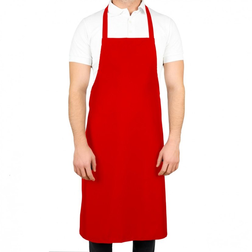 Kırmızı renkte, desen içermeyen ve mutfakta kullanım için uygun bir önlüktür.