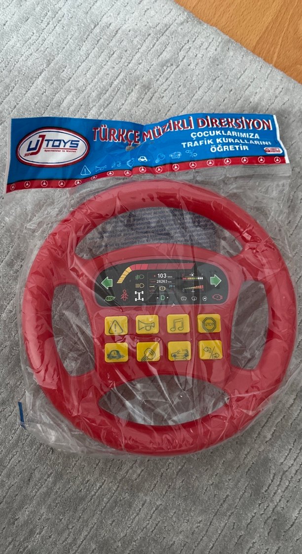Kırmızı renkli, müzikli direksiyon oyuncak çocuklara Türkçe trafik kurallarını öğretir. Farklı ses ve ışık butonları bulunur.