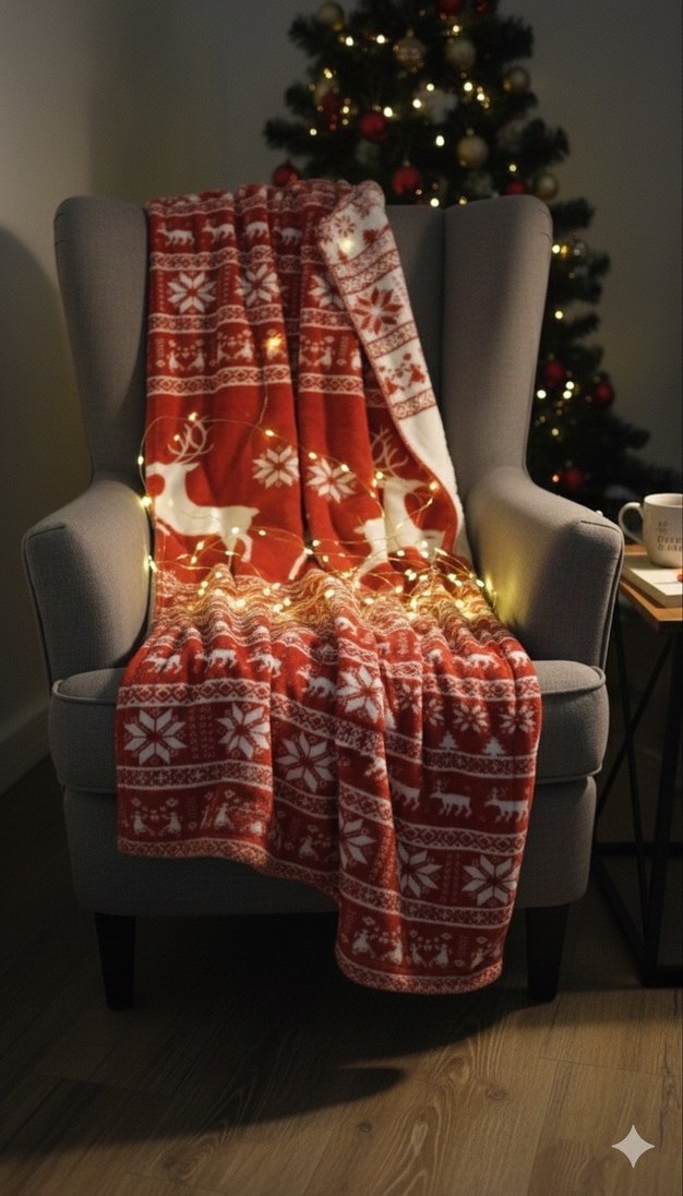 Geyik ve kar tanesi desenli, nakışlı açık kırmızı battaniye, kış akşamları için rahatlık sağlar. ❄️