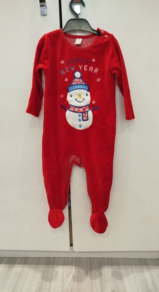Renkli kırmızı bebek erkek tulumu, nakışlı detaylara ve örme dokusuna sahiptir. Yumuşak ve sıcak kumaştan yapılmıştır, "Happy New Year" yazılı kar adamı desenlidir. ❄️