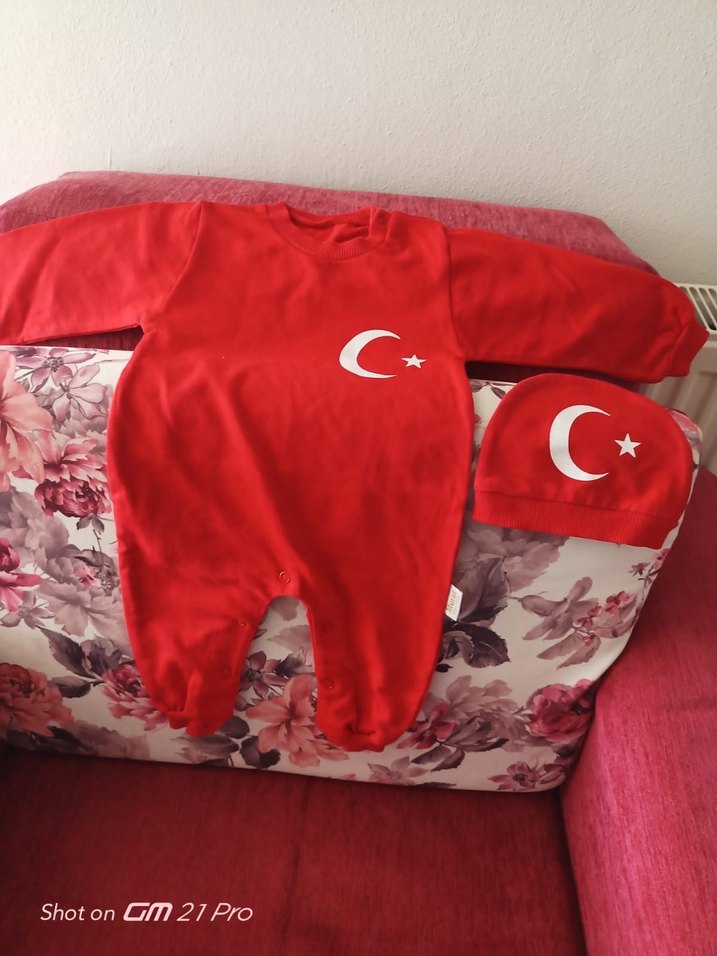Kırmızı renkli, ay ve yıldız nakışlı bebek tulum ve şapka seti. Yumuşak ve sıcak kumaştan üretilmiştir.