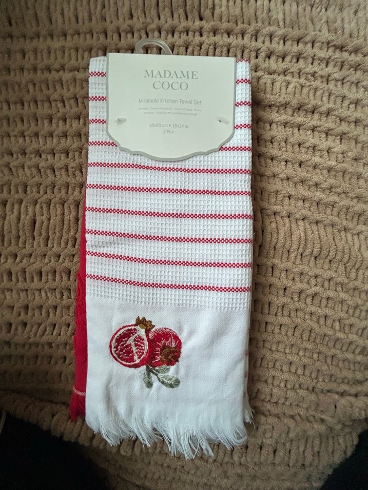 Kırmızı ve gri tonlarda, nar nakışlı bohem tarzda mutfak havlusu seti. Yumuşak kumaştan, püsküllü kenarlı. Marka: MADAME COCO. İkili mutfak havlusu