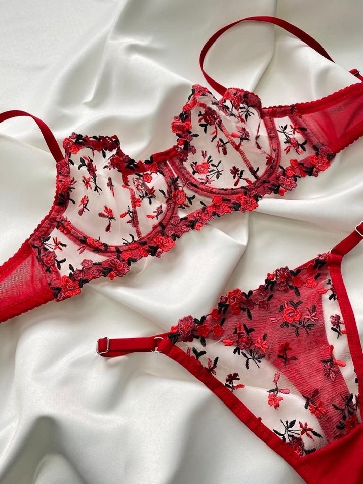 Koyu kırmızı renkte, nakış detaylı, bohem Parisian tarzında yarı saydam sütyen ve külot takımı. Normal uzunlukta, şık bir tasarım sunar. 75-80-85-90