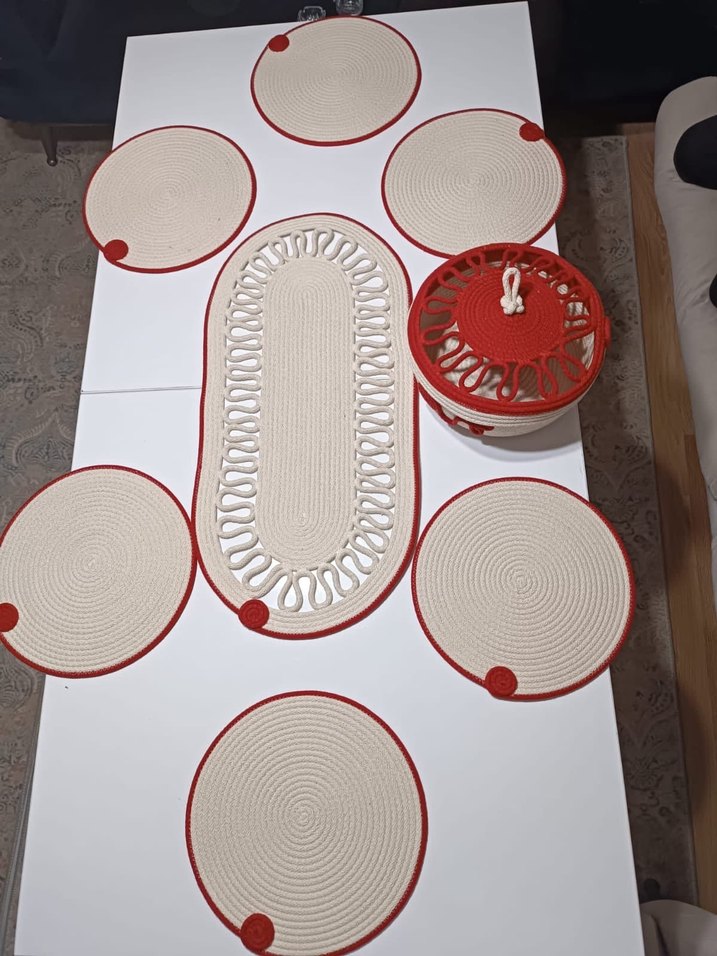 Bohem tarzda, açık kırmızı nakışlı yuvarlak Amerikan servisler ve oval masa ortası içeren sofralık set.