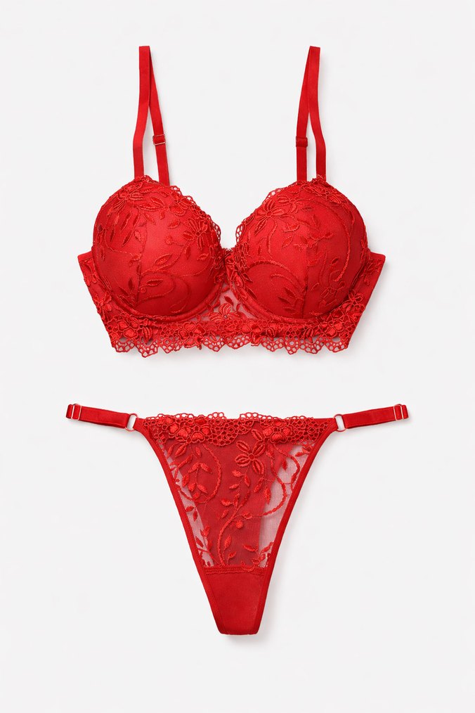 Kırmızı nakışlı çiçek desenleriyle süslenmiş, bohem tarzda sütyen ve tanga takımı. Ayarlanabilir askılar ve dantel detayları bulunur. ❤️