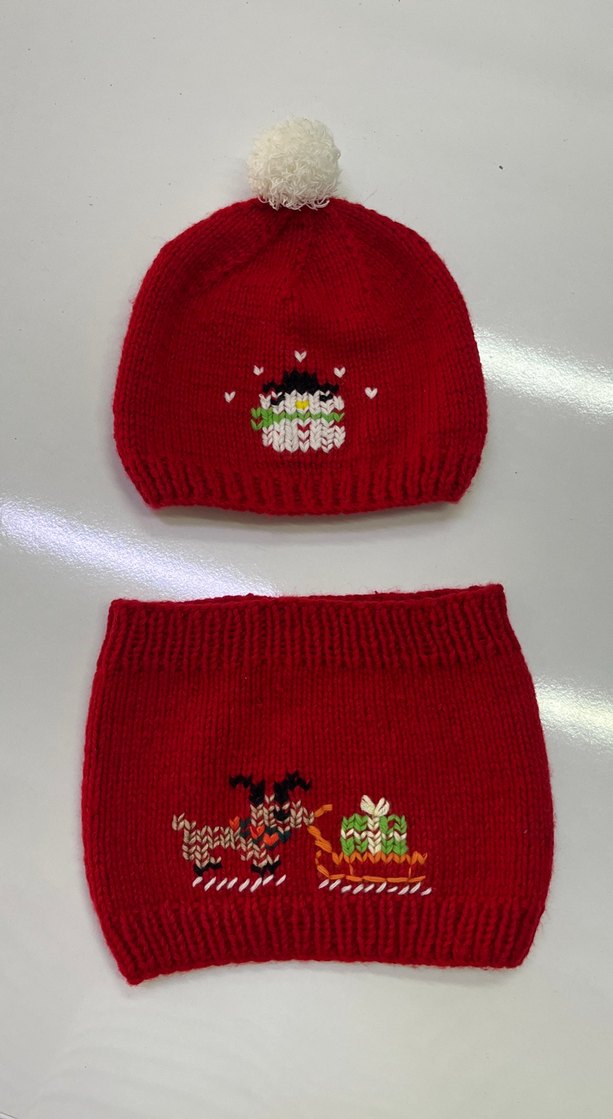 Kırmızı örgü çocuk bere, beyaz ponponlu ve nakışlı desenli, uyumlu nakışlı boyunlukla birlikte.