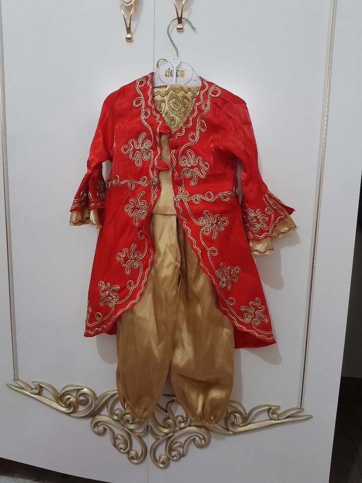 Kırmızı parlak ipek görünümlü, nakış işlemeli, yakalı ve drapeli uzun kollu bol kesim çocuk klasik takım. Altı altın sarısı ipek görünümlü pantolon.
