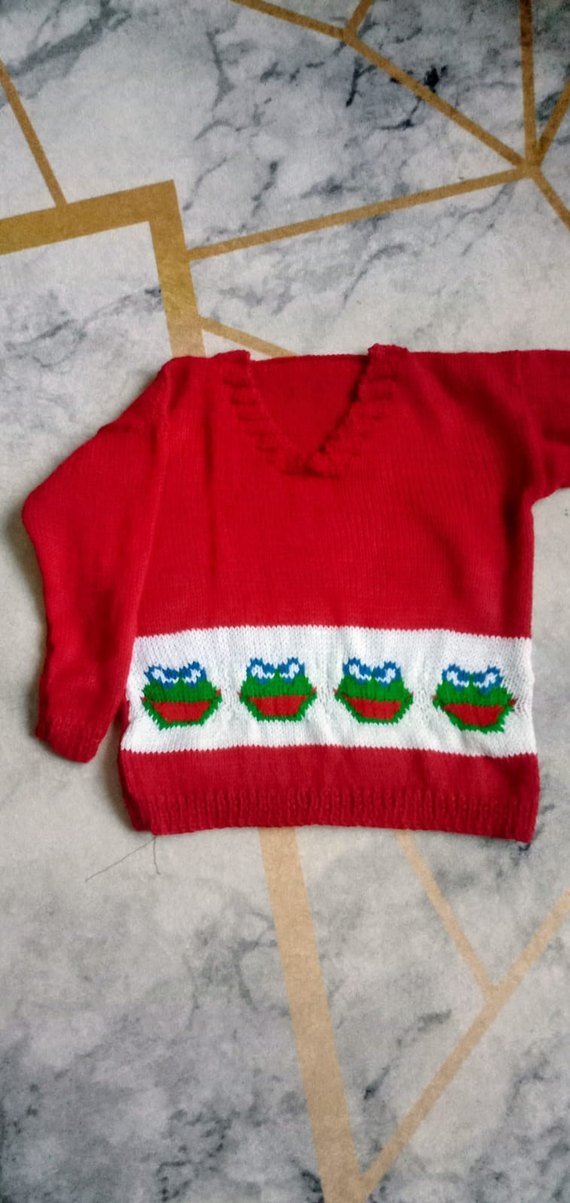 Kırmızı örgü çocuk kazak, uzun kollu ve V yaka. Ön kısmında renkli nakışlı kurbağa desenleri bulunur, bol kesim ve streetwear tarzında. satış amaçlı örüldü. hiç giyilmedi.