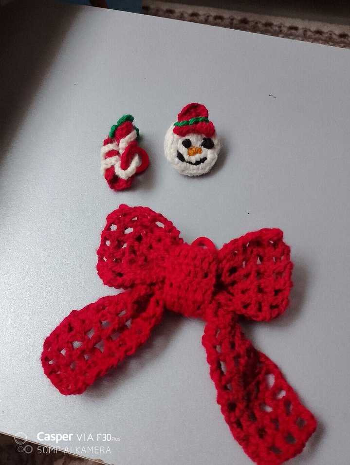 Renkli nakışlı çocuk saç aksesuarları, kırmızı fiyonk ve şenlikli desenler içerir. Örgü kırmızı fiyonk toka ve iki küçük dekoratif tokadan oluşur. anahtarlıklar da her modele göre mevcuttur sipariş üzerine fiyatlar değişiyor
