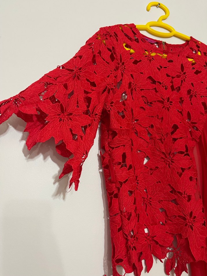 Renkli kırmızı bluz, nakışlı dantel detaylara sahip, bol kesim ve uzun kollu, bohem tarzıyla partiler için uygun. Yeni defosuz ve temiz bir ürün.