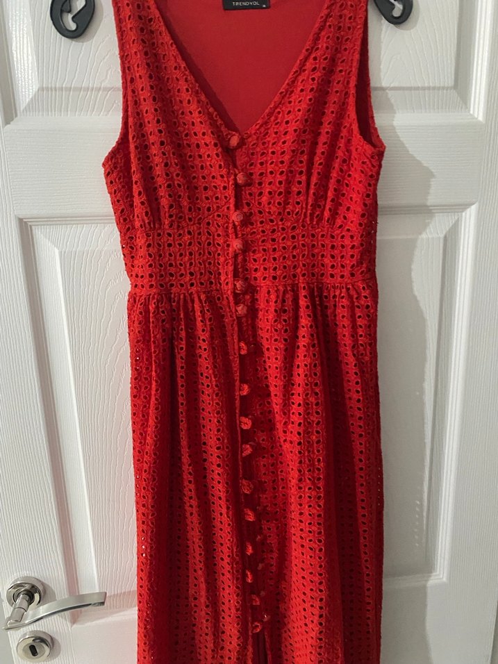 Kırmızı, nakışlı, düğmeli midi elbise. V yaka ve kolsuz, bol kesim. Vintage bohem tarzıyla romantik akşamlar için uygun. ❤️