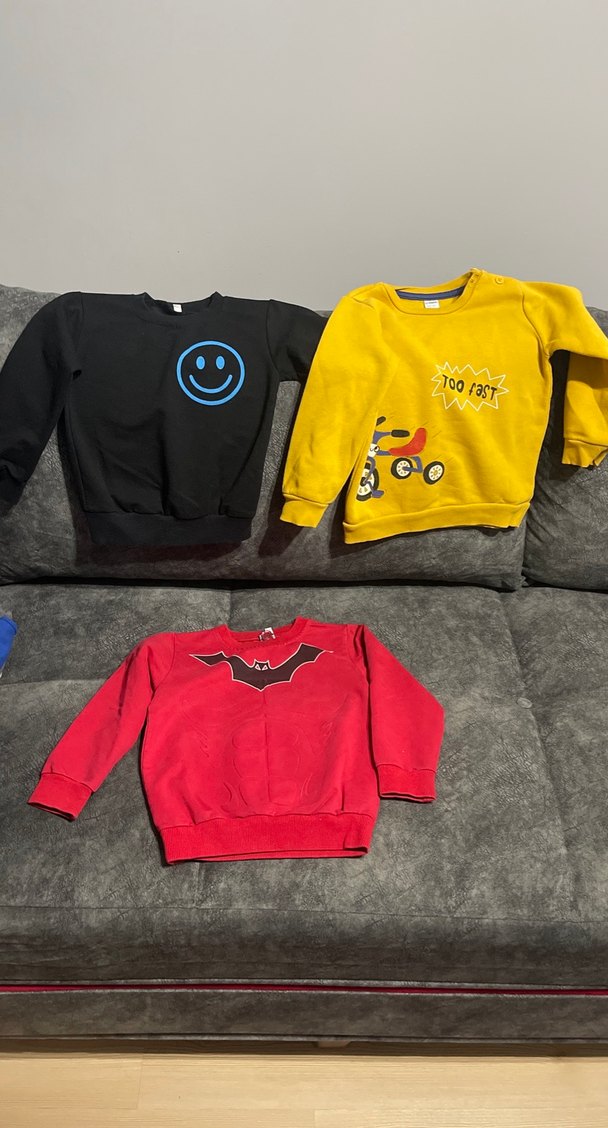 Kırmızı renkli, uzun kollu, yuvarlak yakalı ve bol kesim erkek çocuk sweatshirtü. Yumuşak, örme kumaştan olup yarasa baskılıdır. 3yaş. Tane fiatı