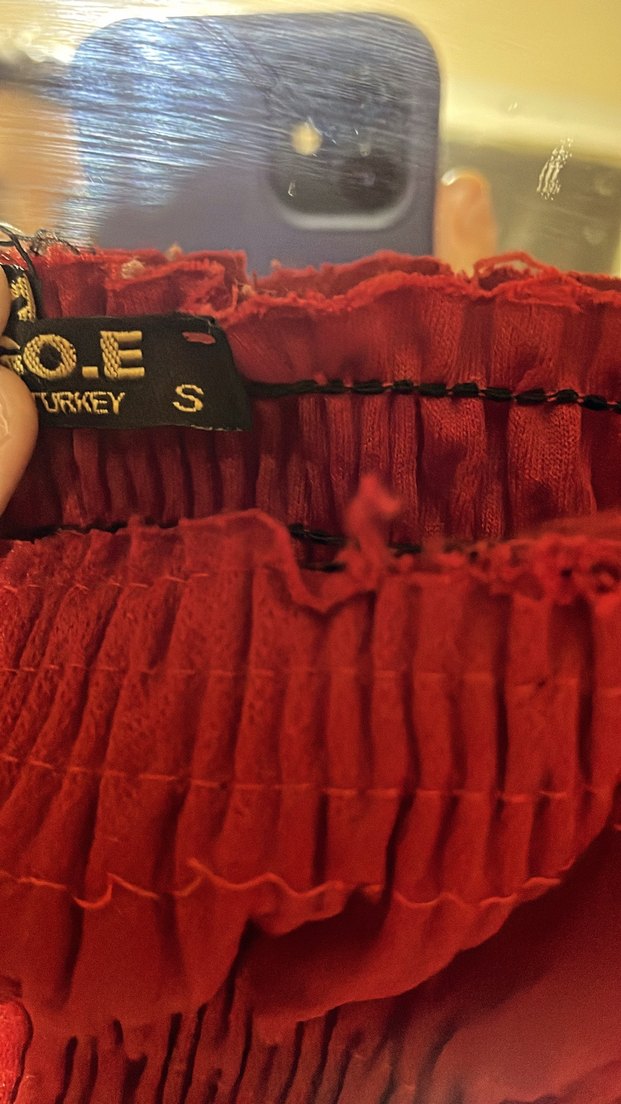 Koyu kırmızı nakışlı, fırfırlı detaylara sahip, s.m uyumlu bohem tarzda midi uzunlukta, vintage görünümlü, S M beden bluz